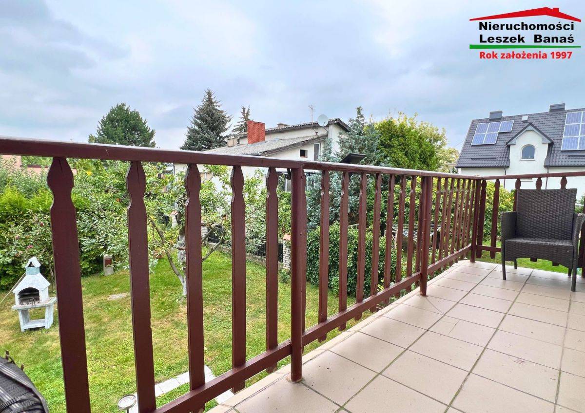 Pierwsze piętro: salon (posiada wyjście na duży taras o pow. ok. 20 m2), pokój, sypialnia (z wyjściem na balkon oraz widokiem na ogród), kuchnia, łazienka, korytarz, klatka schodowa, schody na II piętro. Wejście na I piętro możliwe jest z parteru oraz bezpośrednio po schodach znajdujących się z boku budynku.