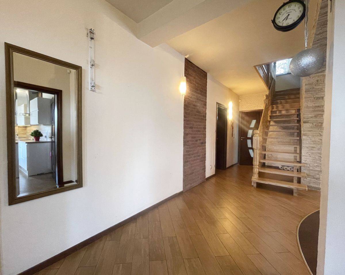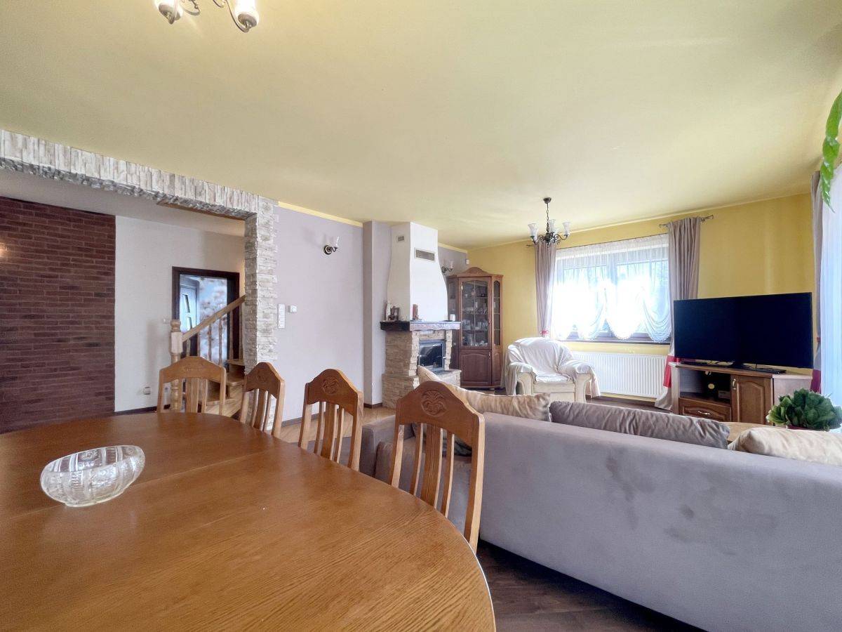Dom wykończony z wysokiej jakości materiałów: gres, panele. Na ścianach gładź. Okna drewniane- 2 szybowe. Ogrzewany za pomocą pieca na eko-groszek. W salonie kominek !