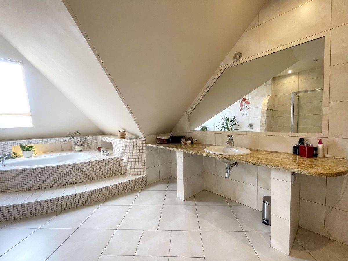Na poddaszu mamy 3 duże sypialnie, łazienkę z narożną wanną oraz prysznicem. Dodatkowo pomieszczenie idealne na pralnię. W głównej sypialni zabudowana garderoba.